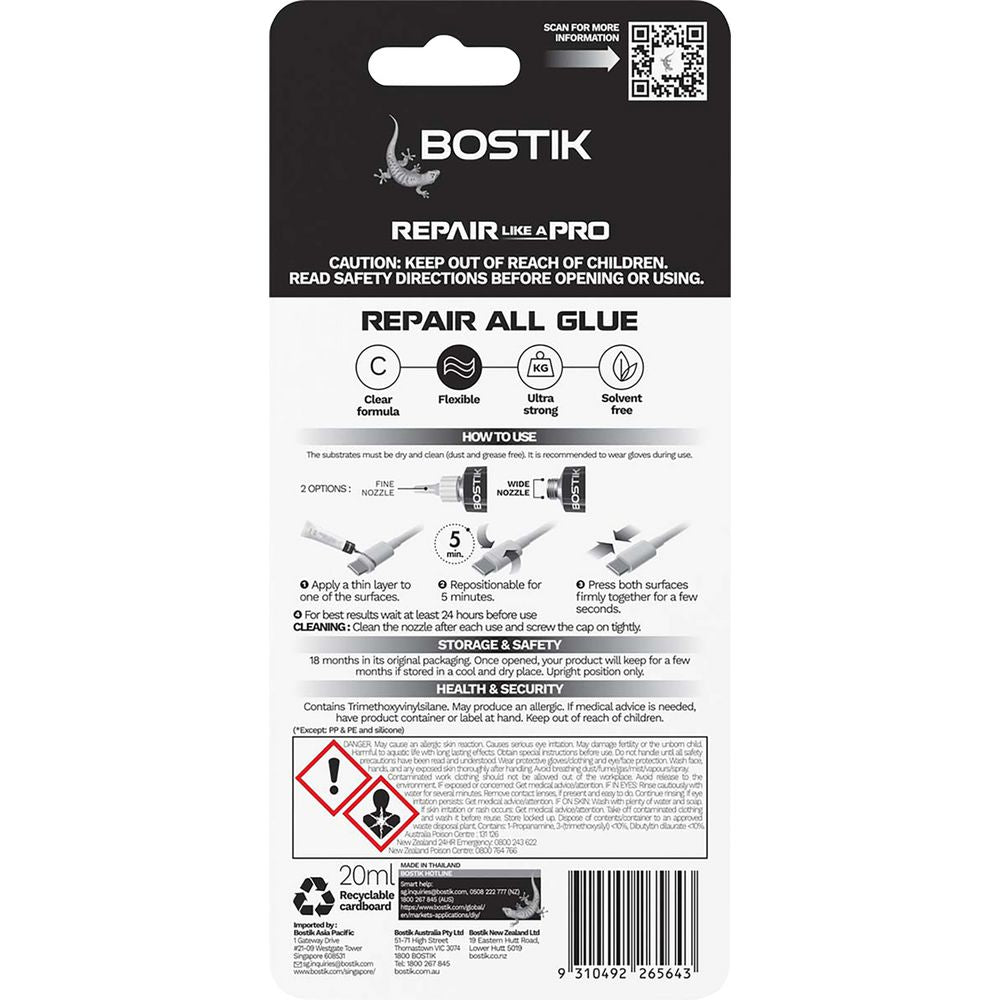 Bostik Repair All is a clear, multi-purpose adhesive for quick, durable repairs around the home, garage, and workshop. It bonds strongly, remains slightly flexible, and is water resistant once cured, making it suitable for everyday fixes and craft projects.