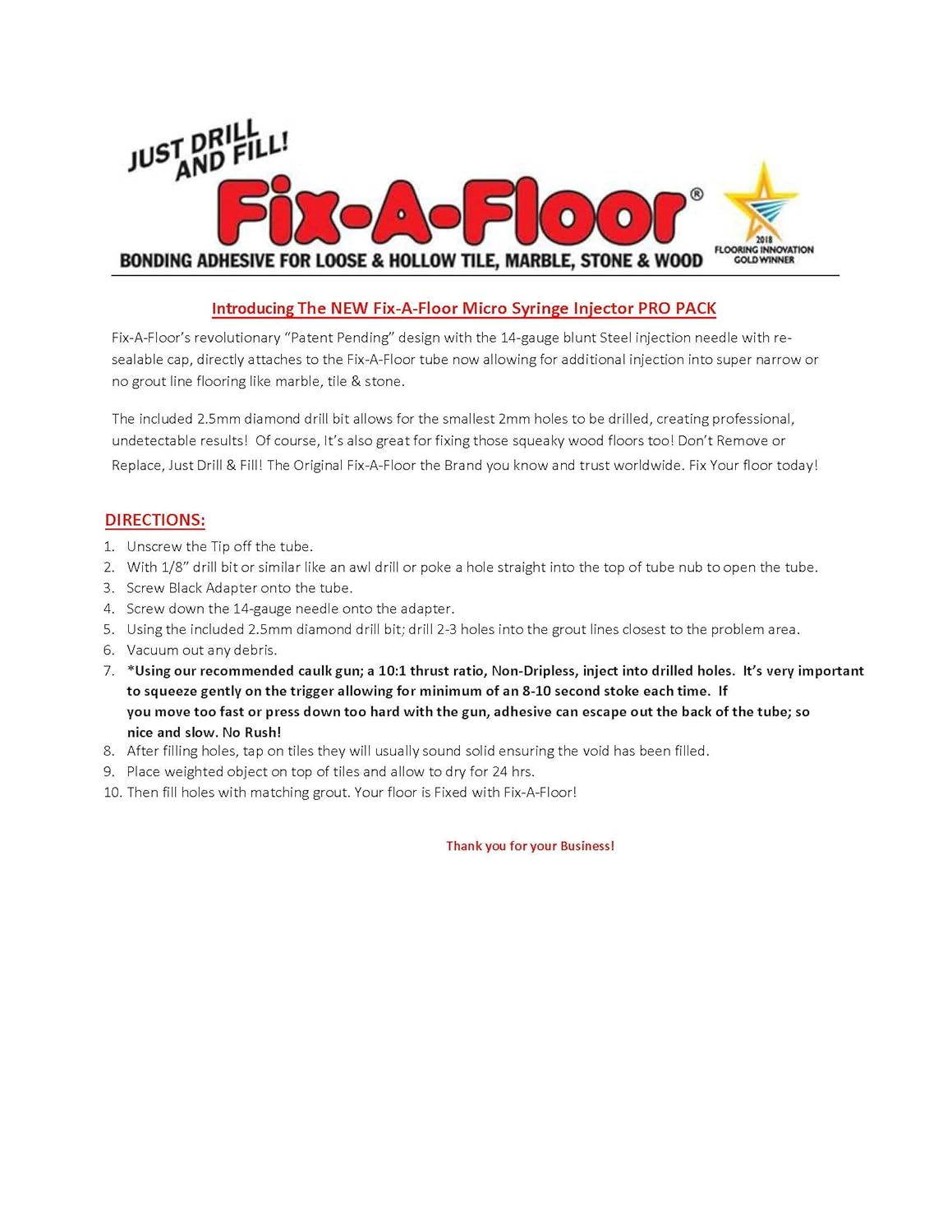 Whether you are repairing a small area or a large floor section, Fix-A-Floor delivers lasting results and is guaranteed for the life of your floor. Just Drill & Fill!