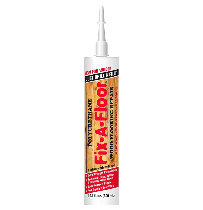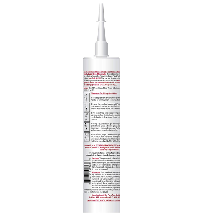 *NEW* Fix-A-Floor Polyurethane Wood Floor Repair Adhesive is an Extra Strength, Super Blend Formula! Created specifically for Re-Bonding those Loose & Hollow, Squeaky, Popping, Bouncy Wood Floors. No need to remove or replace, Just Drill & Fill! The narrow tip allows for the smallest holes to be drilled leaving an undetectable permanent repair. Works on all Hardwoods, Engineered Wood & Bamboo Floors. Good for Indoors & Outdoors, Small or Large problem areas. Odorless, Very Low VOC’s.