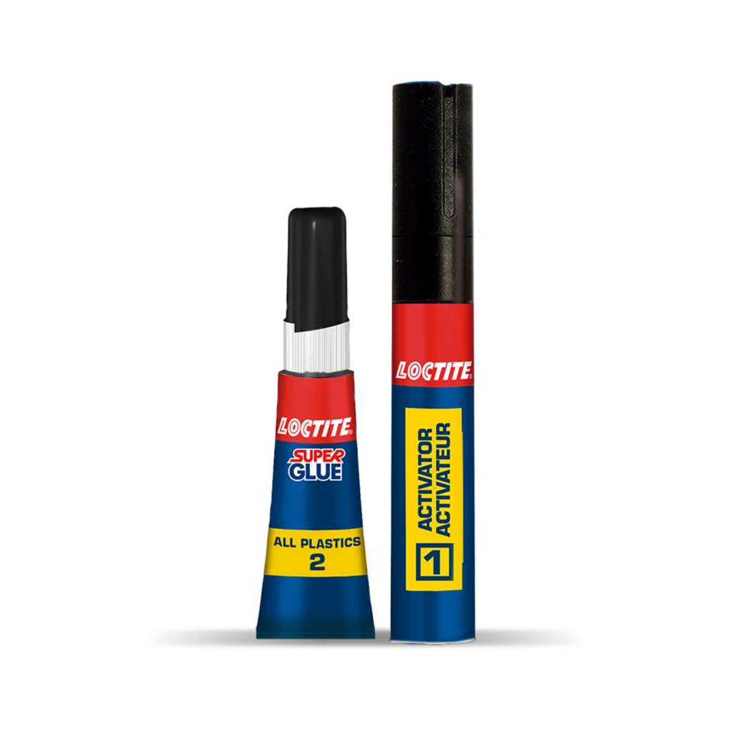LOCTITE Super Glue All Plastics is a rapid dual-action adhesive kit featuring a precision super glue and a surface activator pen. Engineered to bond difficult plastics such as polyethylene (PE), polypropylene (PP) and PTFE, it forms clear, resilient bonds in seconds and resists water, most household chemicals and freezing temperatures. Ideal for repairs on toys, cameras, small automotive parts, wiper blades, rubber seals, figurines and other plastic components.