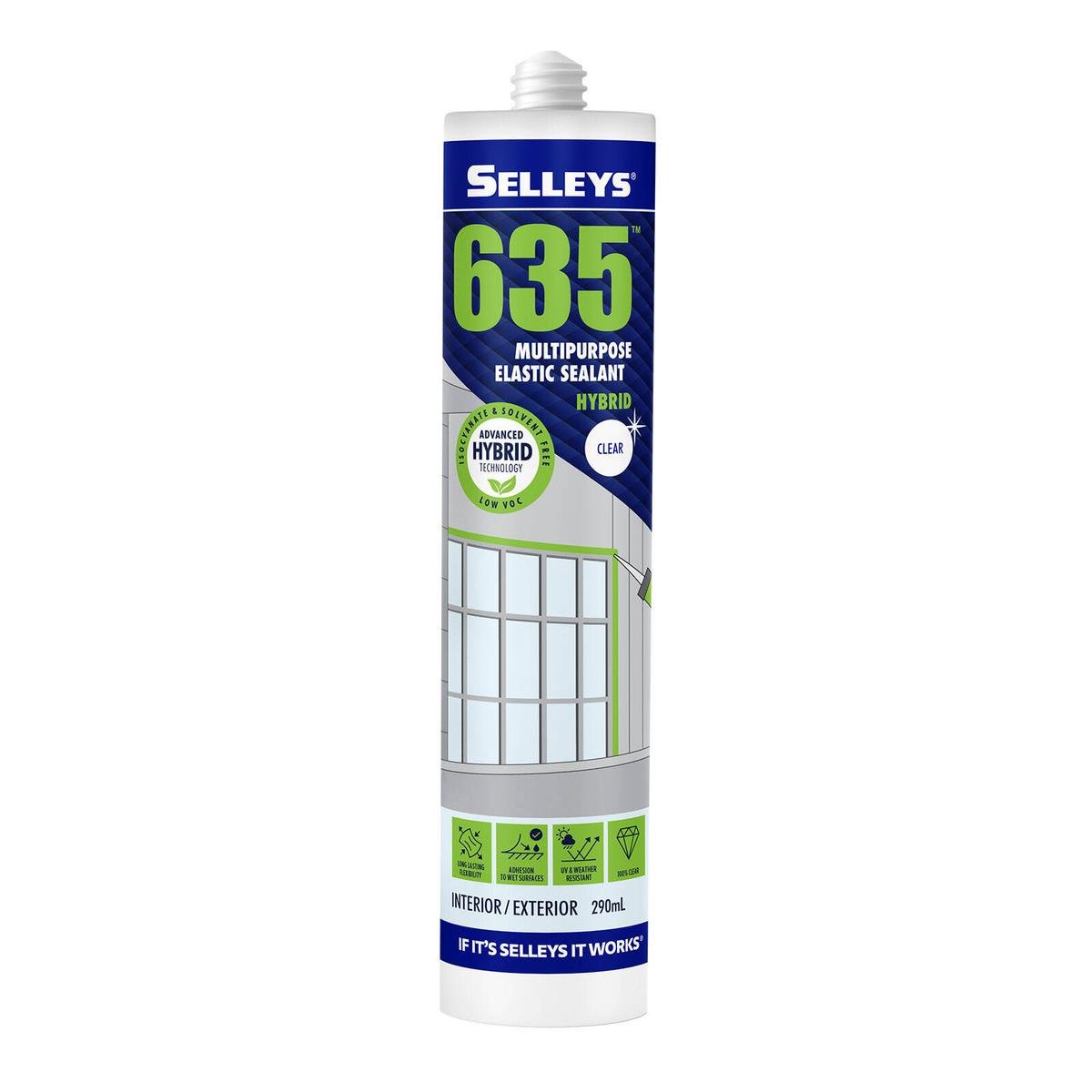 Selleys 635 is a premium 100 percent clear elastic joint sealant that delivers strong, flexible and waterproof seals for indoor and outdoor jobs. Powered by hybrid technology, it adheres to most common building materials without primer and resists UV and weather for long lasting performance. Paintable with water based paints after skinning.